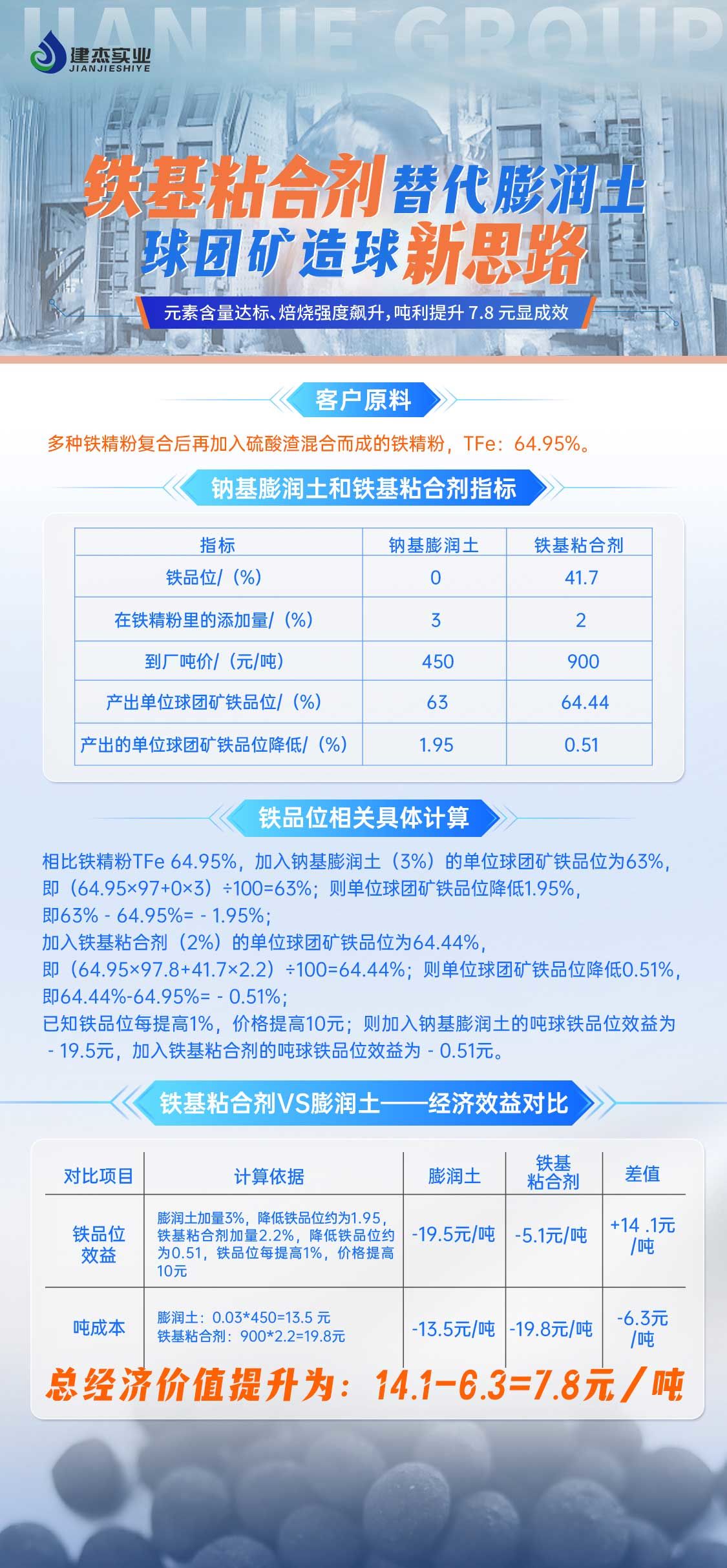 在鋼鐵冶金行業(yè),球團(tuán)礦造球一直是企業(yè)關(guān)注點(diǎn)。建杰實(shí)業(yè)聚焦技術(shù)突破,以鐵基粘合劑替代膨潤(rùn)土的創(chuàng)新方案,為球團(tuán)礦造球帶來(lái)全新思路,助力企業(yè)實(shí)現(xiàn)元素含量達(dá)標(biāo)、焙燒強(qiáng)度飆升,噸利提升 7.8 元的顯著成效 。